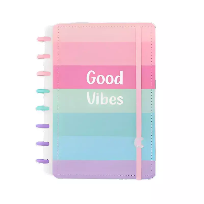 Capa e contracapa rígidas, 01 folha de adesivos, 01 bolsa plástica, 01 folha de instrução de uso e manuseio, com refis e acessórios da marca disponíveis no verso, 01 folha de identificação com calendário no verso, 04 divisórias com abas para identificação (02 pretas e 02 transparentes), 80 folhas offset 90g (60 folhas pautadas e 20 folhas lisas para impressão) e 01 suporte com elástico para 01 caneta ou 01 lápis.